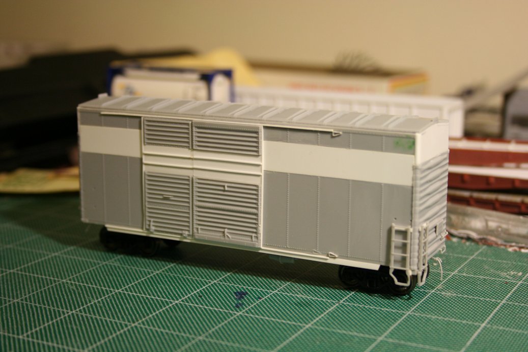 This interesting car represents a standard 40' double door boxcar that was rebuilt by CP Rail to add almost 3 feet to the inside height of the car. These cars were used for appliance service out of the CAMCO plant in Hamilton, ON. There were 3 of these cars converted in the early 1970s, numbered CP 48550-48553. This car will eventually go into service on the WRMRC layout, which represents the CP transcontinental line through Sudbury, ON in the 1970s, therefore I've chosen to model this car as one of the 3 cars in the 48550 series. Unfortunately I do not have any photos of these three cars, but another 30 were converted in 1980 and numbered CP 41000-41029. I do have a few photos of cars in this series, so I am using a little bit of "modeler's license" and making an educated guess that the general details of the two series will be the same.