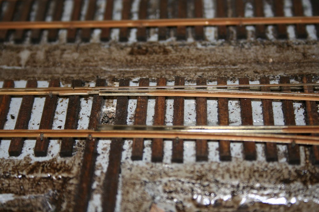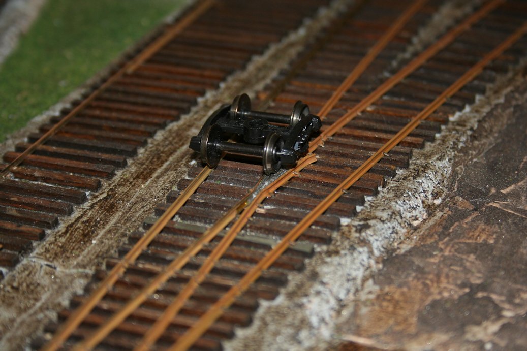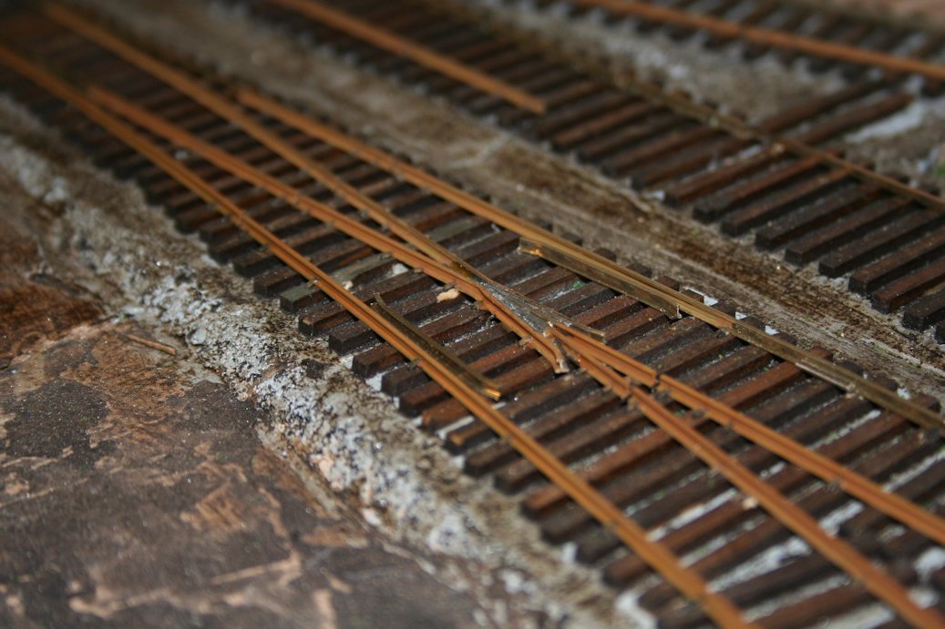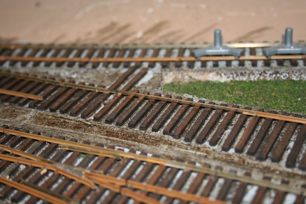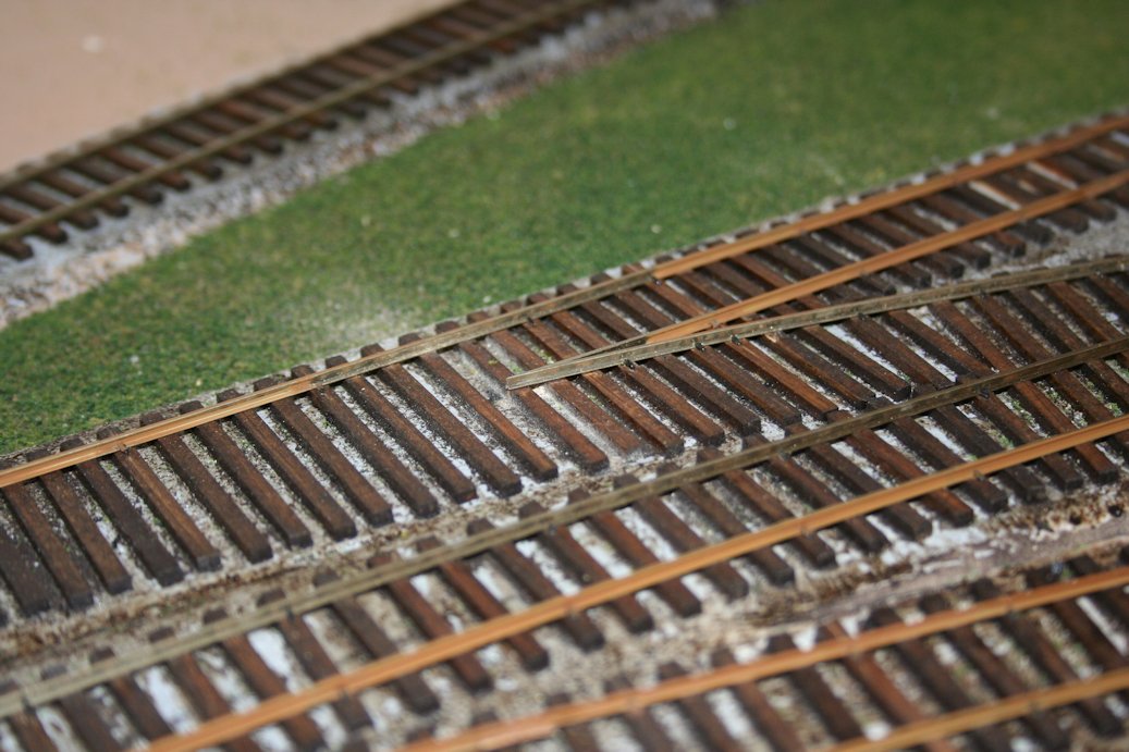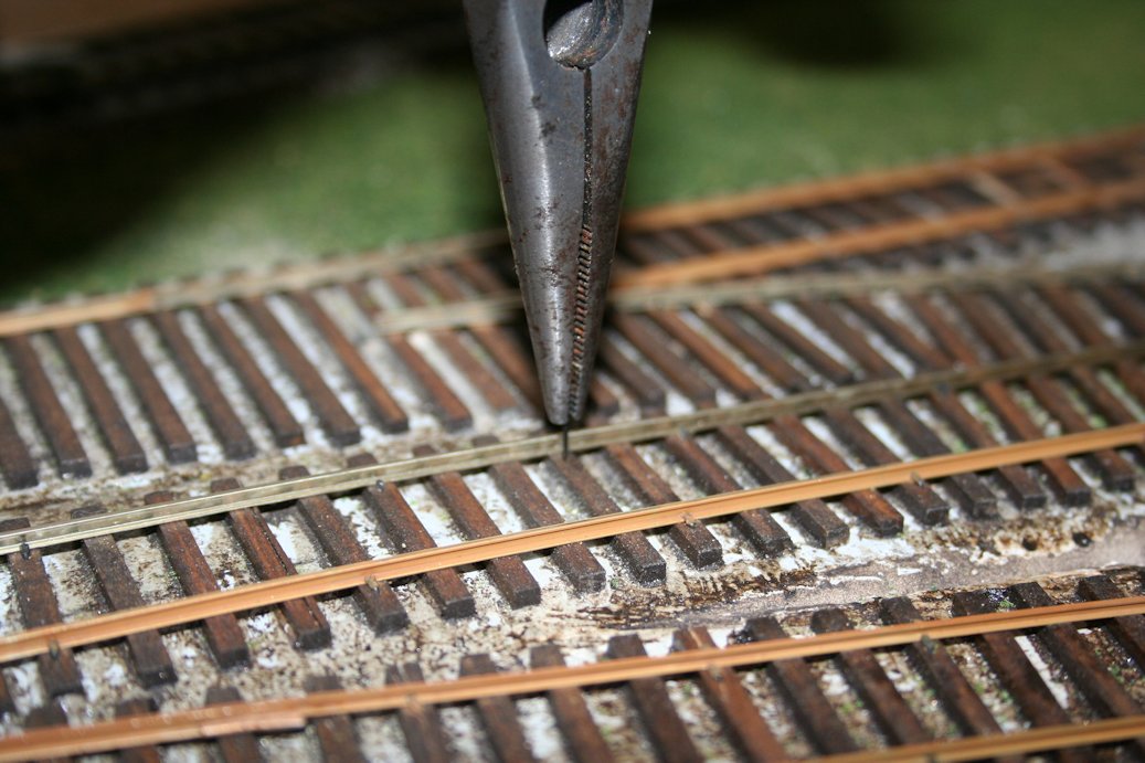 Solder wires to the bottom of the rail so they're less visible. Tin the wire first and use an aluminum soldering probe tool to press the wire firmly against the rail while soldering. (The bits of slag ballast used for weight is my technique to do this without a second person to hold the probe. You kinda need three hands for this.)