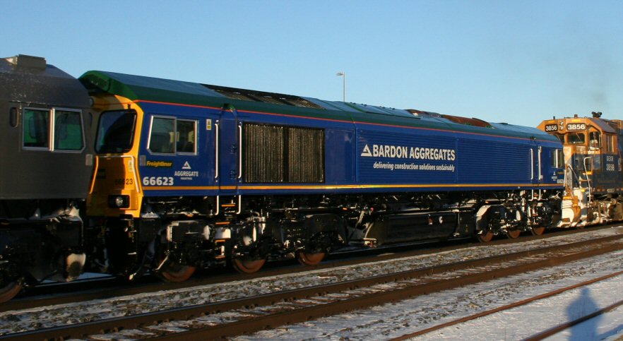 | This brand new Freightliner JT42CWR "Class 66" locomotive is painted in a special paint scheme that was only applied to this one unit. This photo was published in the March 2007 issue of "The Railway Magazine", the first published photo of this unit. This engine was built in London, ON for export to Great Britain, and I caught enroute to Halifax. | |