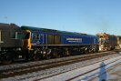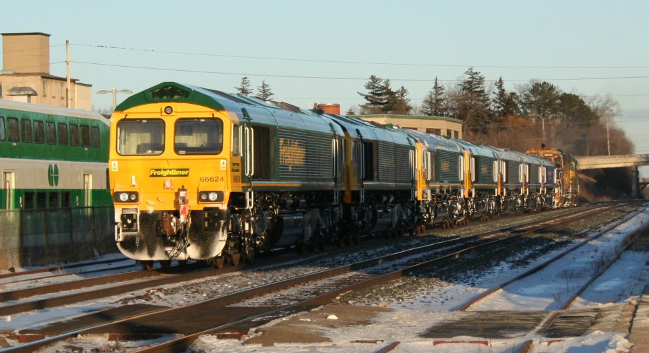 | A special train moving 7 brand new JT42CWR export locomotives for Britain, Belgium and Poland passes through Georgetown, ON. These engines were build at Electro-Motive Diesel in London, ON and will be loaded onto ships at Montreal or Halifax for the journey to Europe. | |