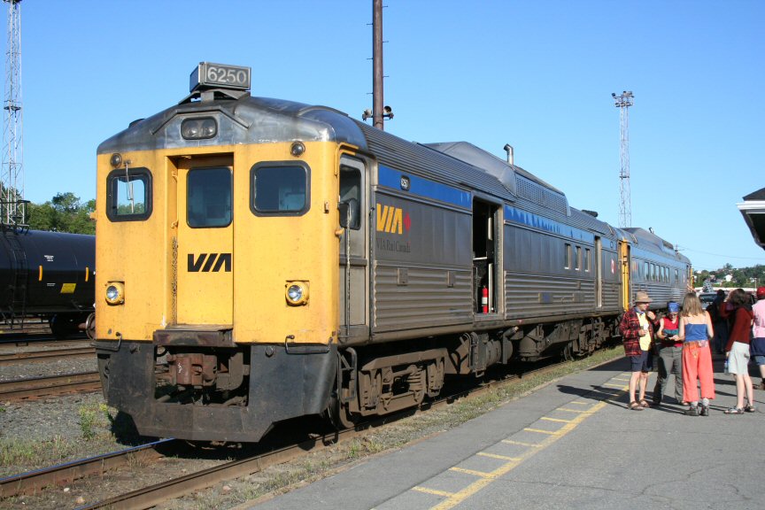 | VIA 6250, a very rare RDC-4 (currently the only one in service anywhere) is paired with RDC-2 6205 on VIA Rail's Sudbury-White River passenger train, seen here loading passengers and baggage at Sudbury on a clear summer day in August 2008. | |