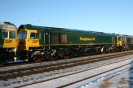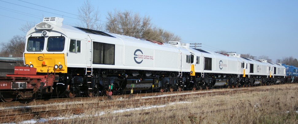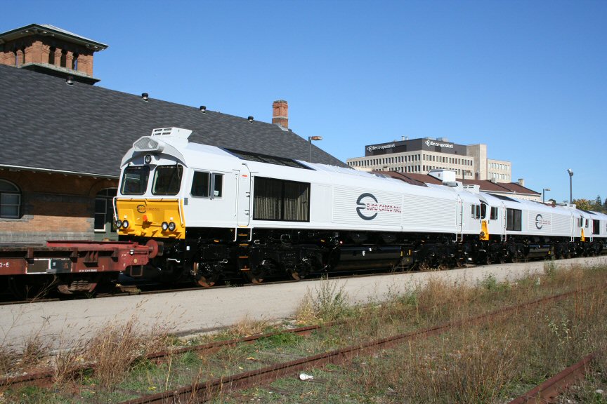 | Another set of four brand new Euro Cargo Rail locomotives pass through Guelph, ON on their first leg of the journey to France. In the background are five more new engines for Algeria. | |
