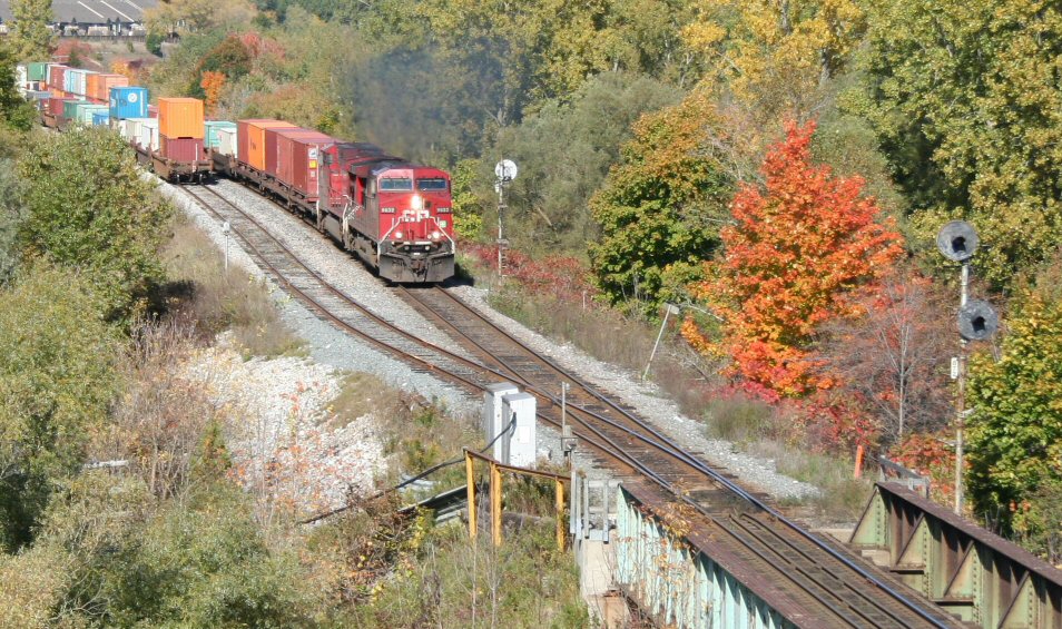 | A pair of Canadian Pacific Railway intermodal trains meet at Coakley siding in Woodstock, ON. October 2008. | |