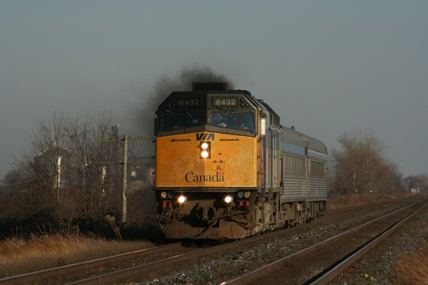 | VIA Rail F40PH-2 charges through the countryside just a few miles from its destination at Sarnia, ON (actually, it has technically just entered the city limits a few moments before although the scenery at this location is strictly farmland.) | |