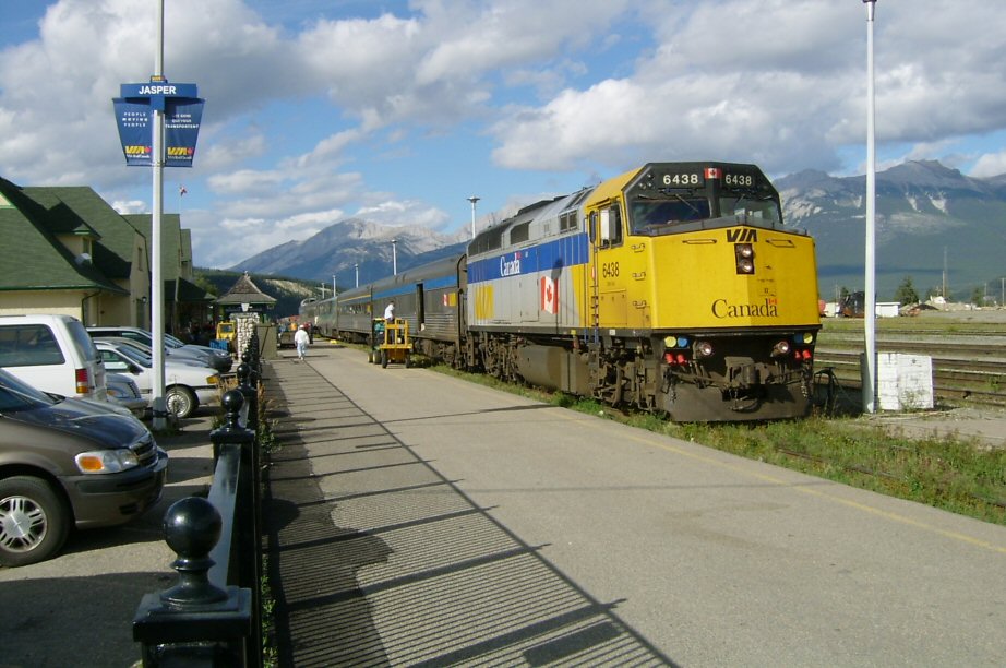 VIA No. 6, the "Skeena", has wyed and arrived at the station at Jasper, AB. August 28, 2004. |