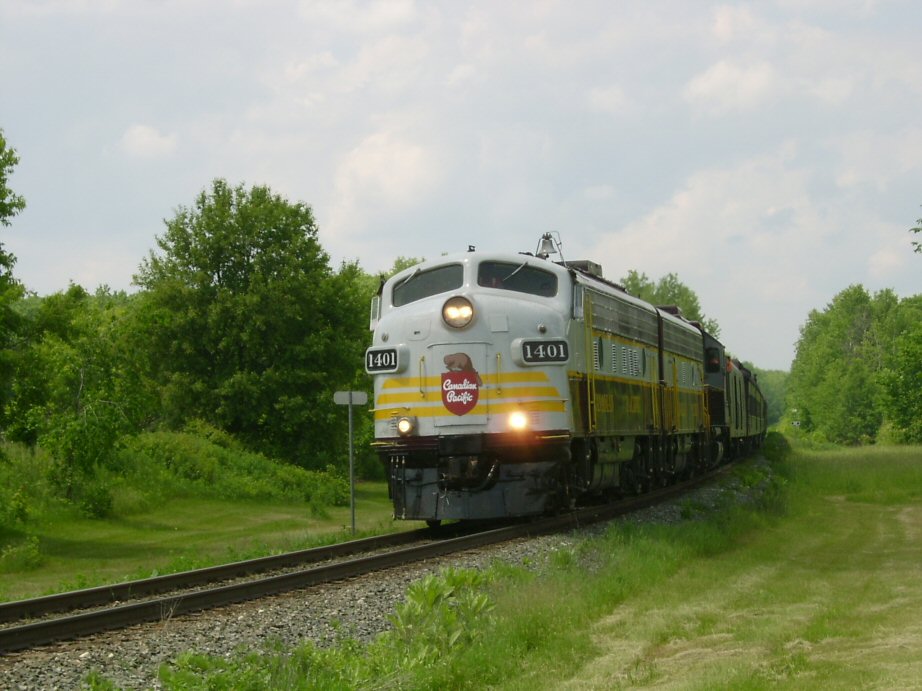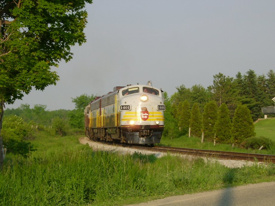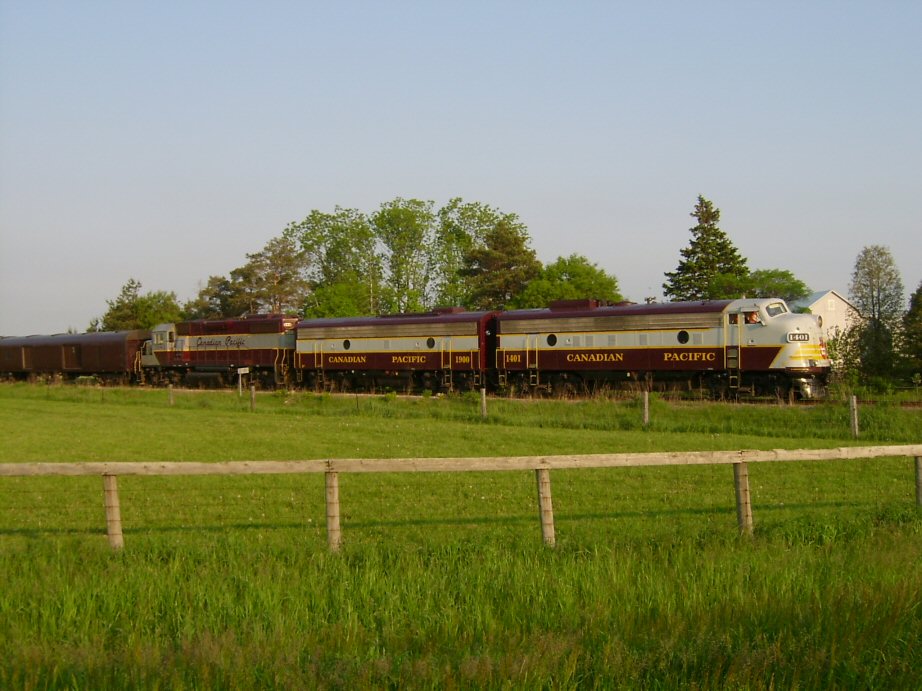 "Passenger Extra 1401 South", the Canadian Pacific's luxury passenger train the "Royal Canadian Pacific" heads south from Guelph Junction towards Hamilton, ON. June 5, 2004. The Royal Canadian Pacific was on a rare-mileage excursion across Canadian Pacific's Southern Ontario rail network. |