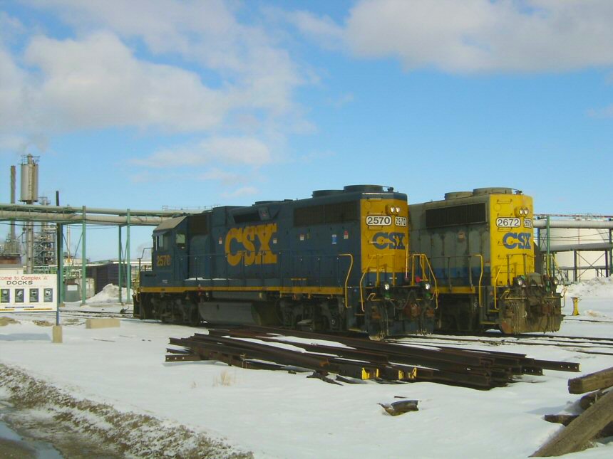 CSXT GP38-2's 2570 and 2672 parked at CSX's Sarnia yard, awaiting their next assignment. February 15, 2004. |