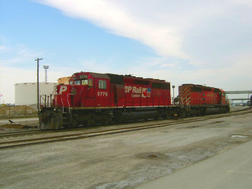 CP SD40-2 5776 and another SD40-2 parked at CSX's Sarnia Yard, April 18, 2004. The CSX Sarnia Sub has no direct connection to any other CSX trackage. CP trains bring freight for CSX from Detroit to the interchange point at Chatham, ON. At Chatham, a CSX crew takes over, but the CP engines remain on the train to run through to Sarnia. |