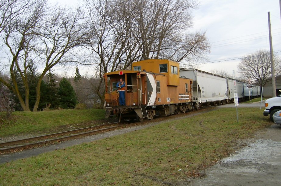 Bringing up the rear - or, in this case, the front. After switching PDI, a plastic pellet rail-truck transfer facility in Guelph, Ontario Southland brought their cars up the the north end interchange with Goderich-Exeter Railway. To get there this afternoon, they pushed all the way across town, caboose leading. November 27, 2004. |