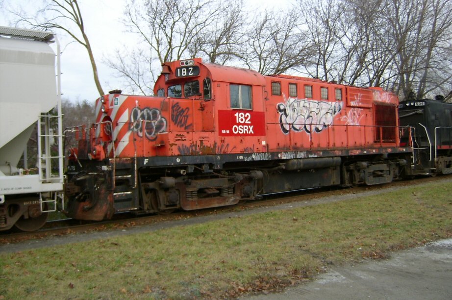 OSRX RS18u 182 (ex-QGRY, ex-CP 1801). This engine was delivered to OSR just the day before, and they gave it a test spin. However, the engine was low on fuel and ran out halfway to Guelph and basically spent the entire time being pulled around by the other two working engines, RS23 506 and M420W 646. This engine has since received a complete repaint into Ontario Southland's attractive maroon and cream colour scheme. |