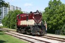 | Ontario Southland Railway RS23 504 shows off the OSR's attractive maroon and cream colours as it eases back onto its train after setting off a historic wooden caboose owned by the Guelph Historical Railway Association in a little-used siding track in downtown Guelph for temporary display over the weekend. | |