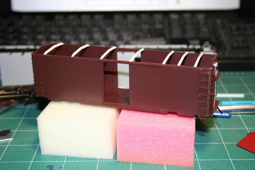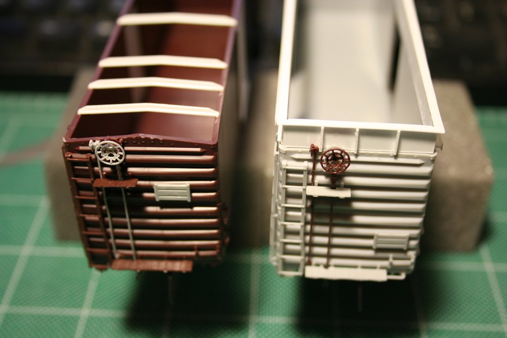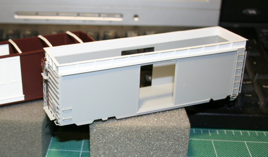 This kitbash of an Intermountain 40' PS-1 boxcar kit represents a car from Canadian Pacific's 269000 series rebuilt in 1968 as an open-top car for transporting woodchips. The roof was removed and sides extended for greater capacity. The custom hinged doors still need to be built.